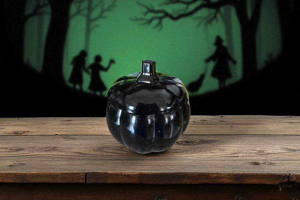 • Premium black ceramic pumpkin jar with matching lid (forever spooky dĂ©cor)