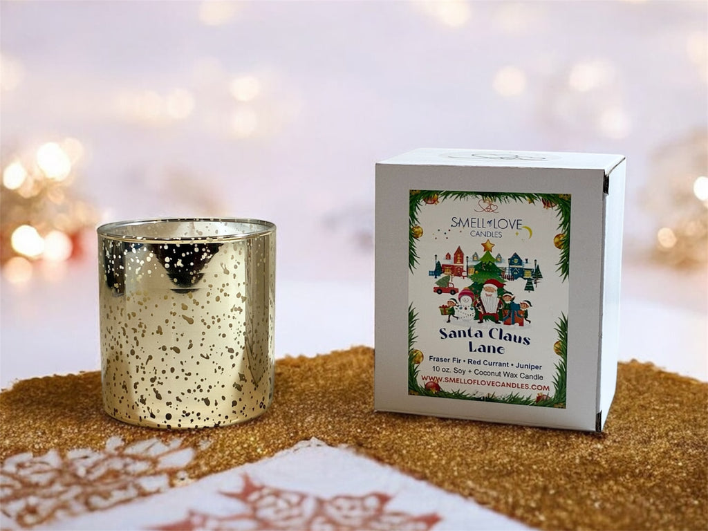 Evoke the festive magic of Santa Claus Lane with this enchanting candle. Housed in a shimmering 10 oz. gold twilight jar, it captures the essence of holiday wonder with its captivating blend of crisp Fraser fir, sweet red currant, and earthy juniper. Perfect for creating a warm, inviting atmosphere throughout your home during the season of joy and celebration. A limited edition treasure that brings the spirit of Christmas to every room.