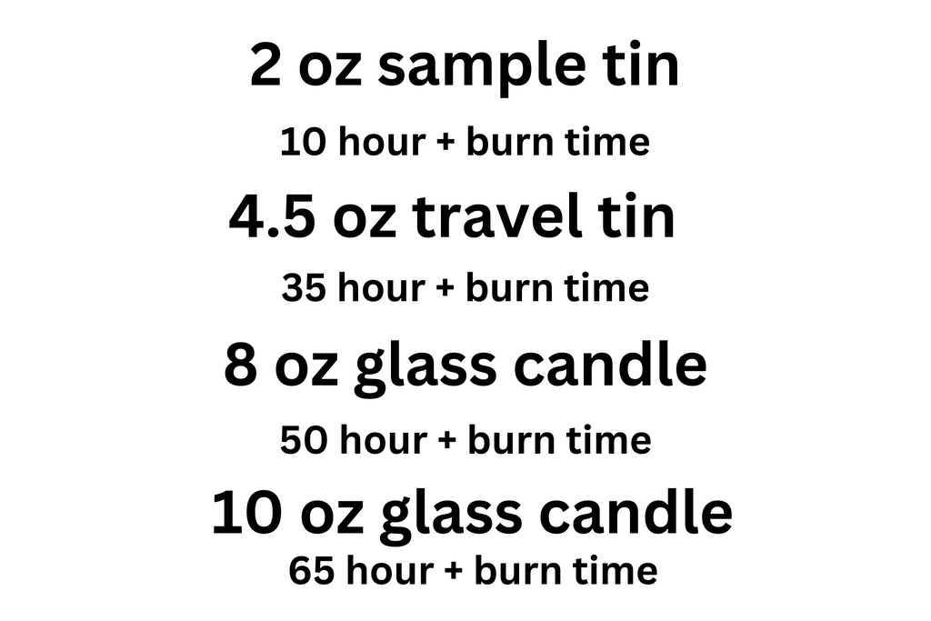 When choosing your candle size, please consider the room that you will be burning your candle in. Our 2 oz sample sizes are just that; they are meant to give you a sample of the scent and will not fill an entire room. Our 4 oz candle is meant for small spaces such as a bathroom or small den/work room. Our 10 oz glass jars are meant for medium spaces.